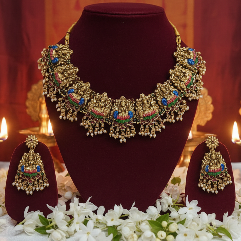 Traditional Matte Finish Lakshmi Motif Temple Necklace Set